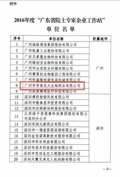 為貫徹落實《中共廣東省委 廣東省人民政府關于加強新時期科協工作的意見》(粵發[2013]2號)精神,充分發揮科協系統的組織網絡、人才智力和科學技術優勢,進一步加快實施創新驅動發展戰略,將院士、專家等高端人才引入企業,幫助企業解決技術難題,培養科技創新人才,促進產學研合作,提高企業核心競爭力,依據《廣東省“院士專家企業工作站”管理辦法(試行)》的規定,經有關單位申請、地方科協推薦、實地考察調研,省科協決定在廣州市華南農大生物藥品有限公司等44家單位建立“廣東省院士專家企業工作站”。建站期為2016年12月至2019年12月。