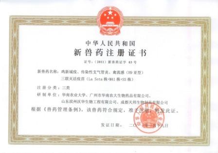 經(jīng)過科研人員的共同努力,公司于2011年1月19日獲得雞新城疫、傳染性支氣管炎、禽流感(H9亞型)三聯(lián)苗滅活疫苗(La?。樱铮簦嶂辏停矗敝辏樱又辏┬芦F藥證書。