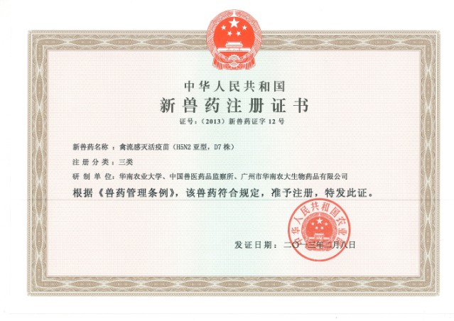 根據(jù)《獸藥管理條例》和《獸藥注冊辦法》規(guī)定,廣州市華南農大生物藥品有限公司與華南農業(yè)大學、中國獸醫(yī)藥品監(jiān)察所3家單位共同申報的禽流感滅活疫苗(H5N2亞型,D7株)通過了國家農業(yè)部的審查,批準為新獸藥。即將取得農業(yè)部核發(fā)的《新獸藥注冊證書》,證書主要信息如下: