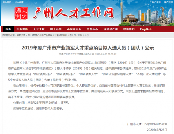 2019年度廣州市產(chǎn)業(yè)領(lǐng)軍人才重點(diǎn)項(xiàng)目擬入選人員(團(tuán)隊(duì))公示鏈接: