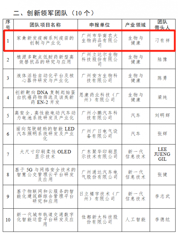 5月23日,2019年度廣州市產(chǎn)業(yè)領(lǐng)軍人才重點(diǎn)項(xiàng)目擬入選人員(團(tuán)隊(duì))公示,按照關(guān)于加快集聚產(chǎn)業(yè)領(lǐng)軍人才的意見相關(guān)規(guī)定,經(jīng)申報(bào)評(píng)審各項(xiàng)程序,廣州市華南農(nóng)大生物藥品有限公司擬入選“2019年度廣州市創(chuàng)新領(lǐng)軍團(tuán)隊(duì)”。