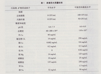 水對養分的消化、吸收、轉運和廢物排泄有著重要的作用。水是廉價、容易得到,也是容易被忽略的重要養分。在大生產中通常會注意給水的數量,即會經常檢查飲水乳頭的好壞,卻容易忽視飲水的質量。實際上在生產中經常遇到的雞群生產成績不正常,易患卵黃性腹膜炎及其他疾病,這種情況通常與飲水質量有關。表1列出了家禽飲水質量的相關標準,在生產中重視飲水質量會給種雞生產帶來事半功倍的效果。