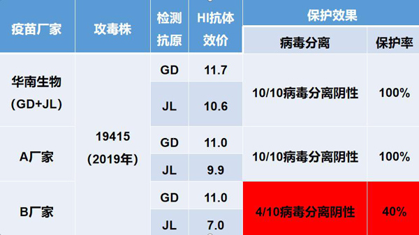 攻毒保護試驗表明,使用華南生物(GD+JL)2019年H9N2疫苗株對流行毒株的攻毒保護率均為100%,明顯優(yōu)于其它競爭廠家,見下圖: