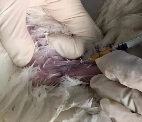 2、找到雞的臂靜脈(內側翼靜脈),靜脈位于二頭肌和三頭肌之間的翅膀下,與肱骨、臂骨平行,區(qū)域類似三角形,幾乎無羽毛覆蓋,很容易找到。