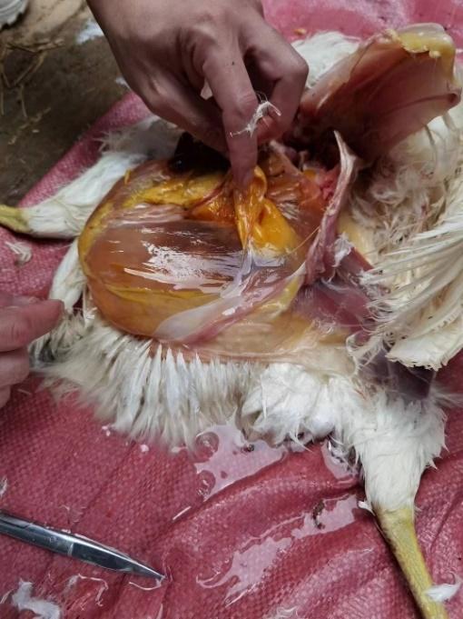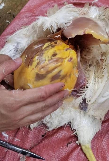 茂名某規?;半u場飼養蛋雞3棟,單棟1.5萬只。A棟雞從開產到230日齡產蛋率一直上不去,維持在85%左右。大群采食量和飲水正常,平均每只雞采食量為105g,大群精神狀況良好,糞便正常。臨床觀察發現個別雞只(30只左右)腹部膨大下垂,觸之有波動感。頭頸高舉,行走時呈企鵝狀姿勢。B棟和C棟無此情況。